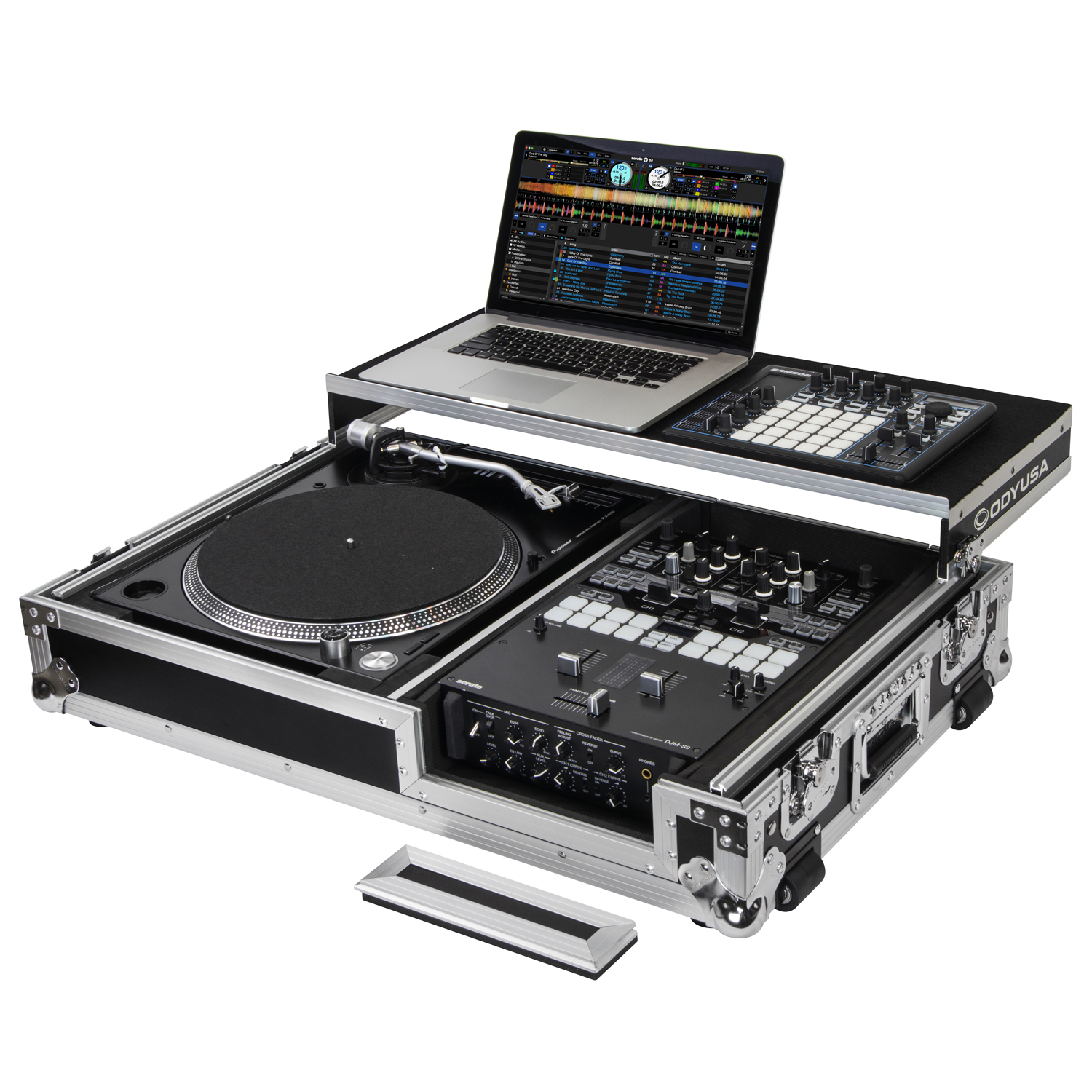 Low Profile 12″ Format DJ Mixer and Two Battle Position Turntables Flight Coffin Case with Wheels and Glide Platform