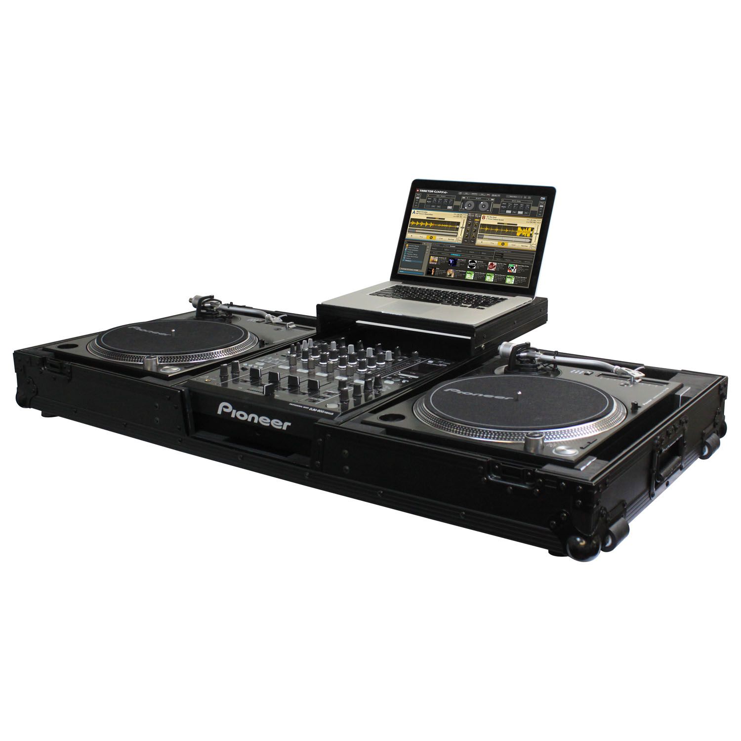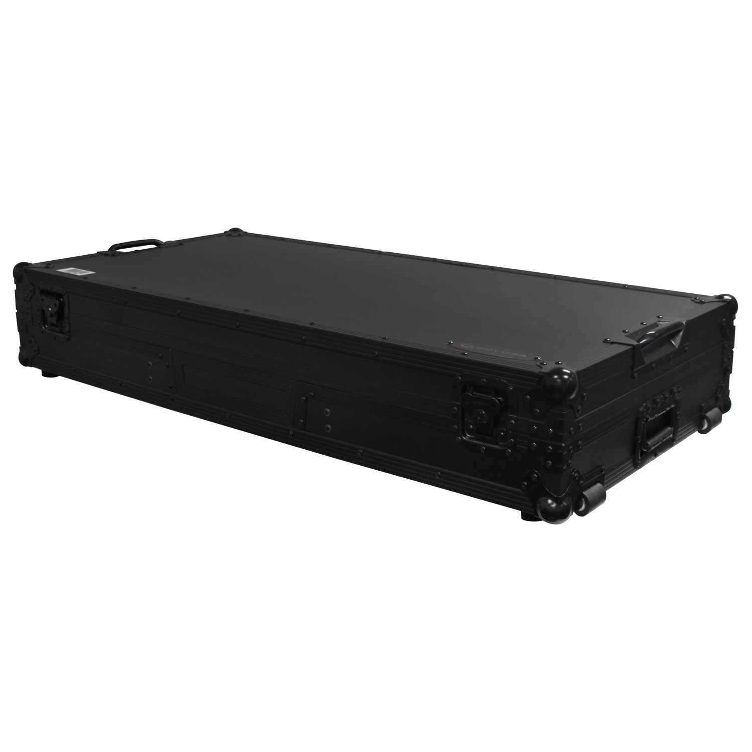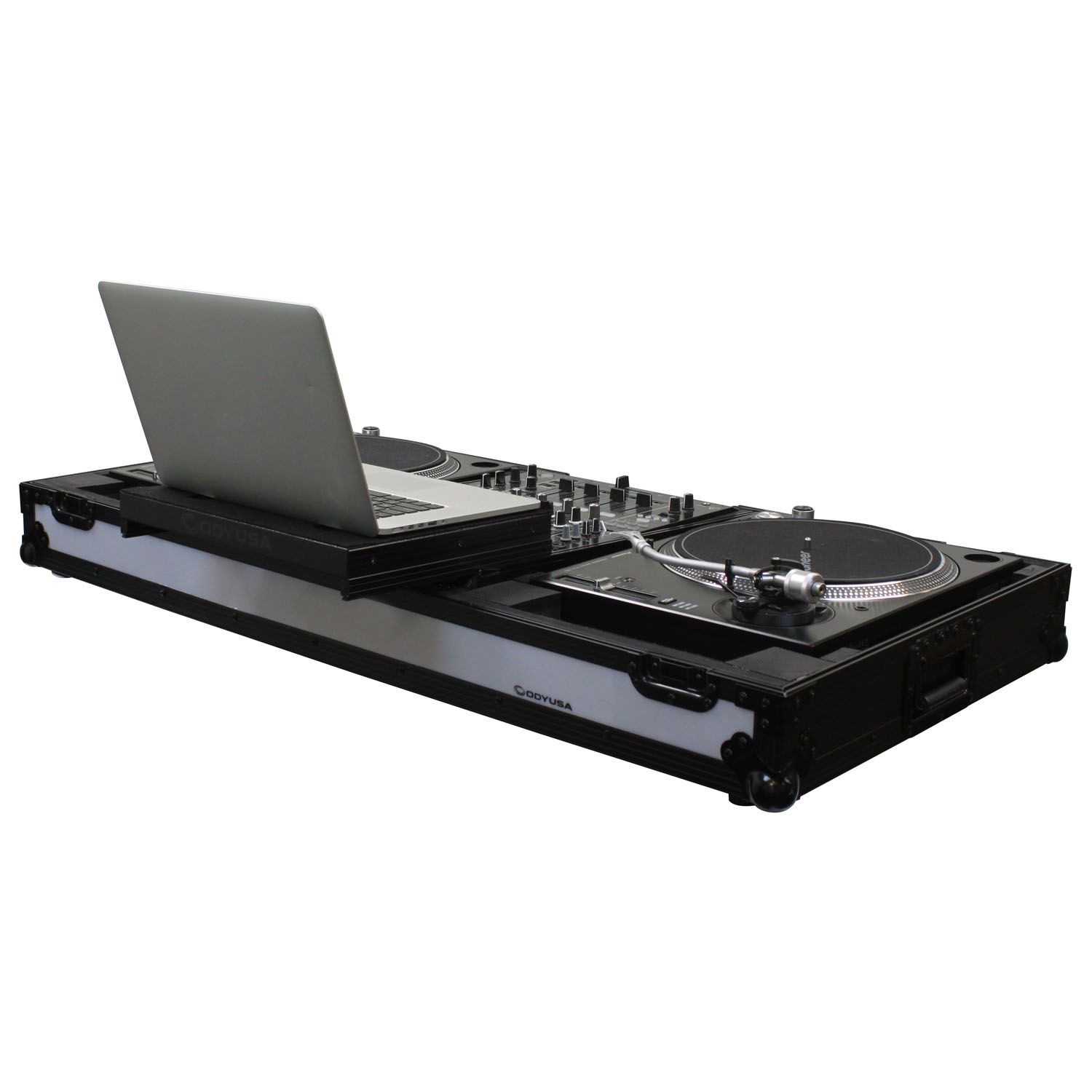The Flight FX™ series FFXGSLBM12WBL Low Profile Glide Style™ Coffin holds one 12" format DJ mixer and two turntables in battle position. Features include rugged built-in roller wheels, sturdy 90 degree handles on the lid, recessed latches and spring-loaded handles, heavy-duty ball corners, and a front mixer section V-cut access panel. Cabling is clean and easy with convenient access ports throughout the rear of the case. Our turntable DJ coffins can accommodate Technics as well as Numark, Pioneer, Stanton, and similar sized turntables.