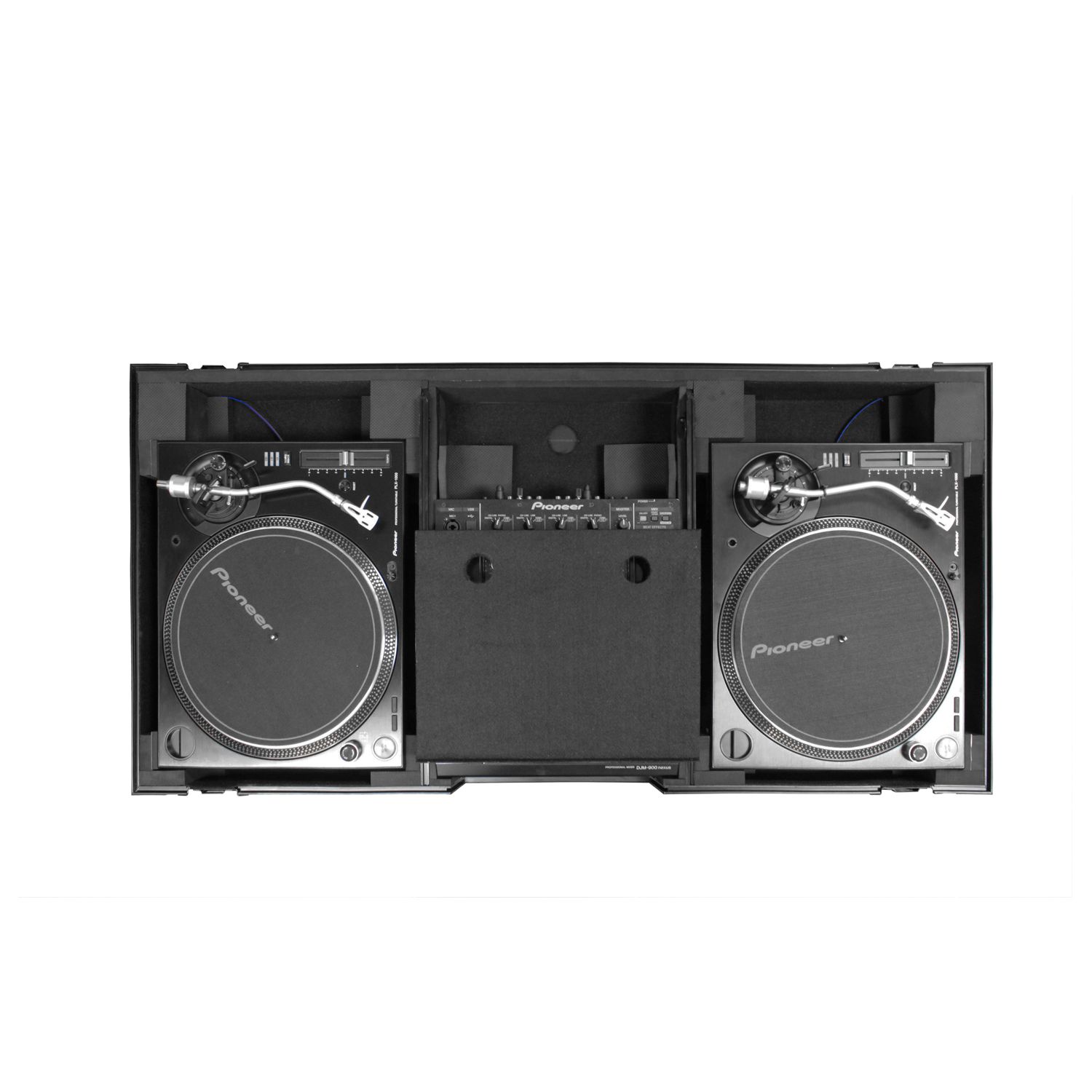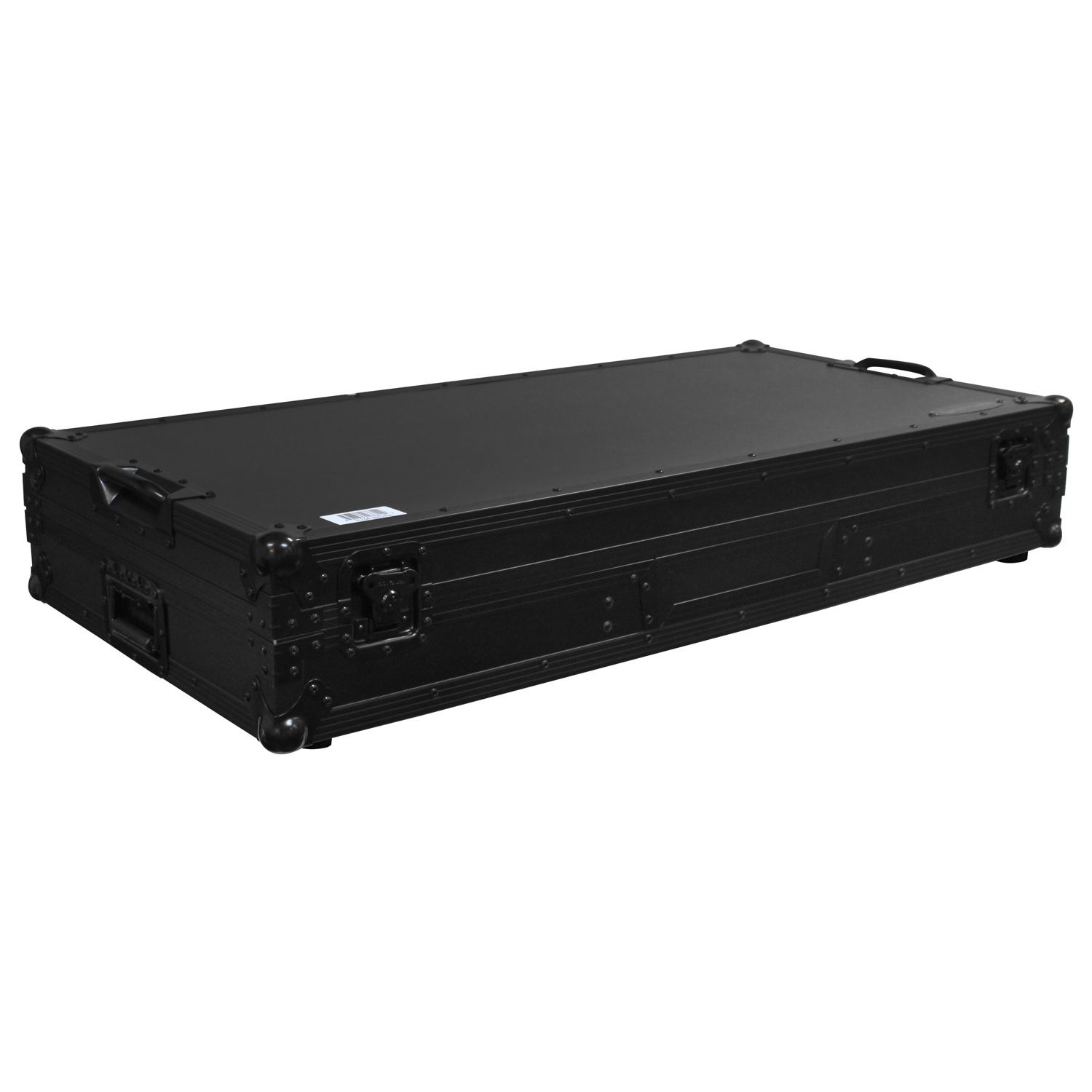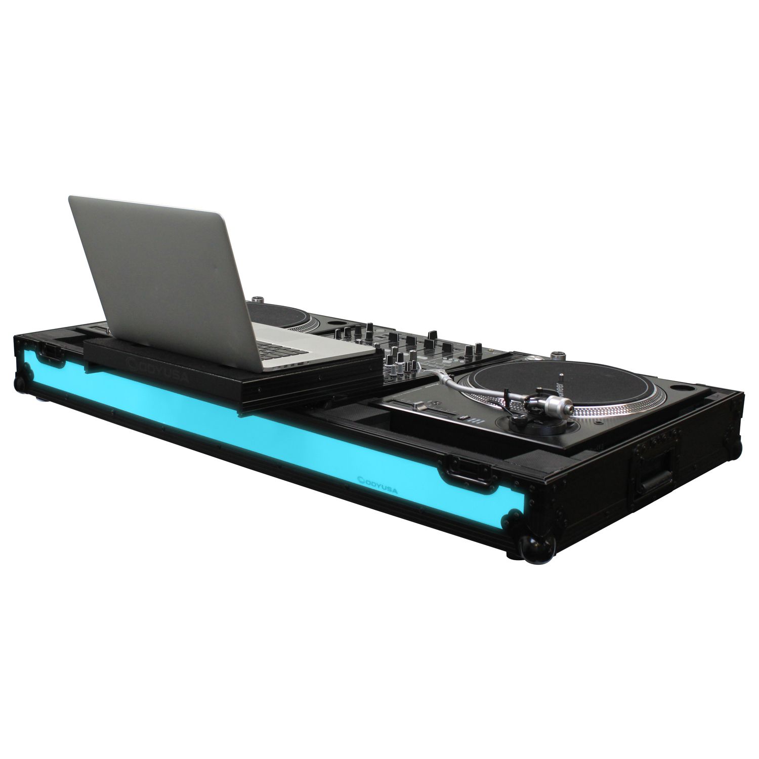 The Flight FX™ series FFXGSLBM12WBL Low Profile Glide Style™ Coffin holds one 12" format DJ mixer and two turntables in battle position. Features include rugged built-in roller wheels, sturdy 90 degree handles on the lid, recessed latches and spring-loaded handles, heavy-duty ball corners, and a front mixer section V-cut access panel. Cabling is clean and easy with convenient access ports throughout the rear of the case. Our turntable DJ coffins can accommodate Technics as well as Numark, Pioneer, Stanton, and similar sized turntables.