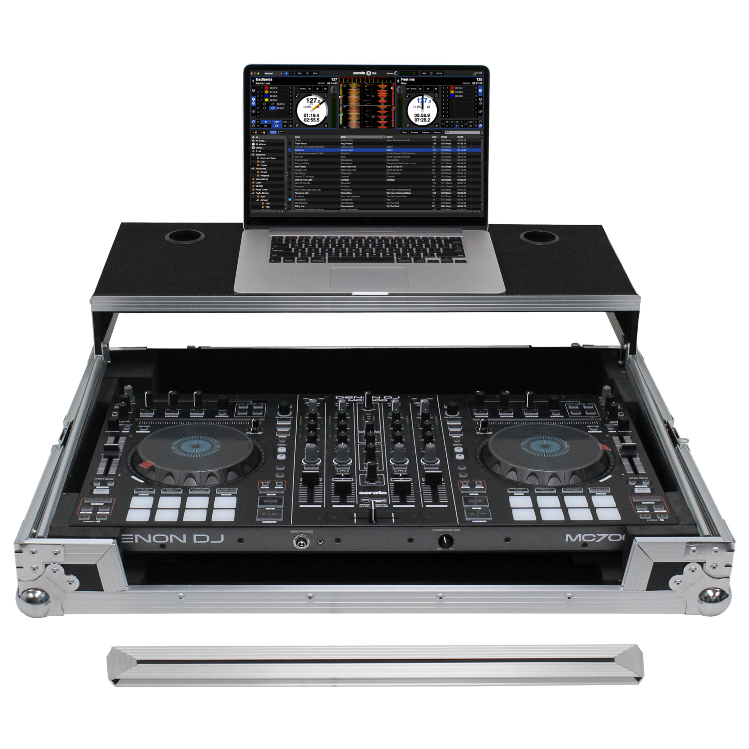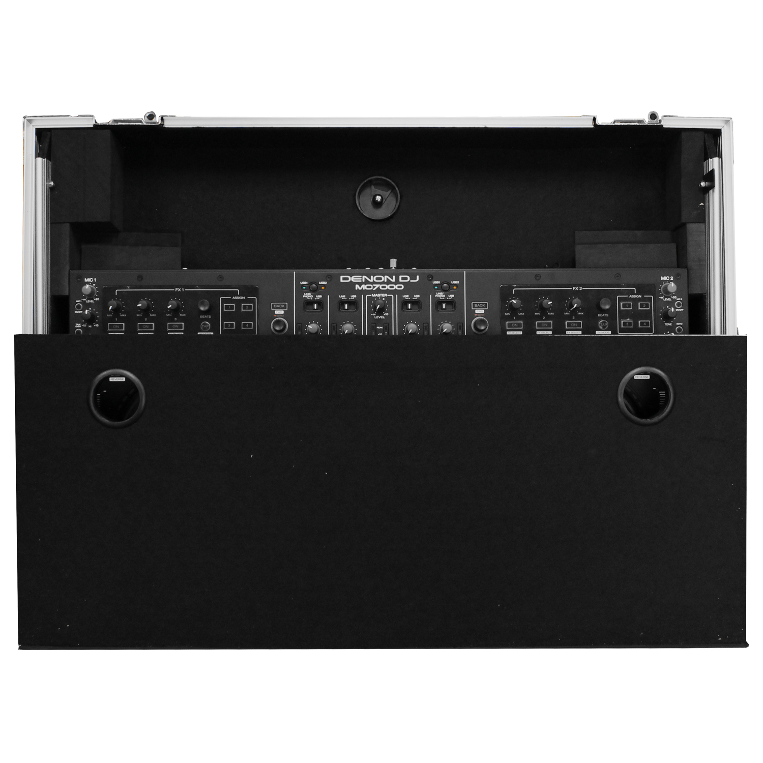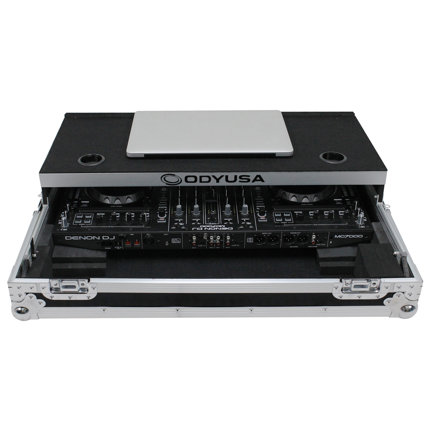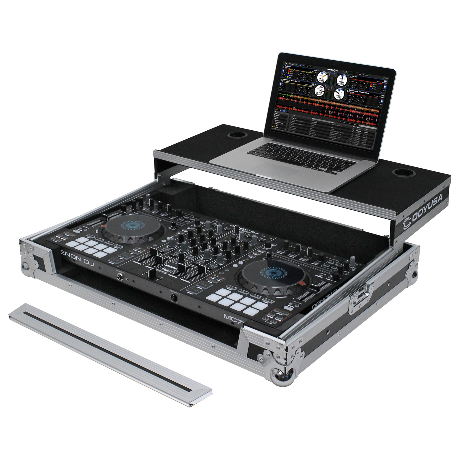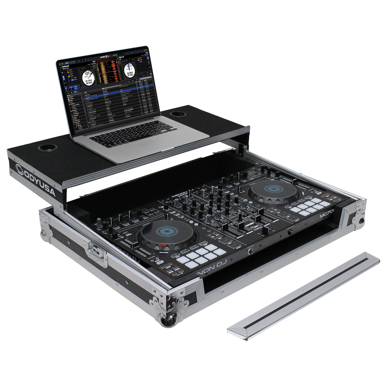 Odyssey presents the Flight Ready™ FRGSMC700 case featuring our patented Glide Style™ gear platform, great for positioning laptops, tablets, effect processors, and other performance essentials where you want over the controller. Specifically made for the Denon MC7000 DJ controller, it features a front stylish V-Cut™ removable panel that allows for easy access to the headphones port and fader control knob. A spacious ventilation pit under the controller is ideal for storing cables and other accessories.