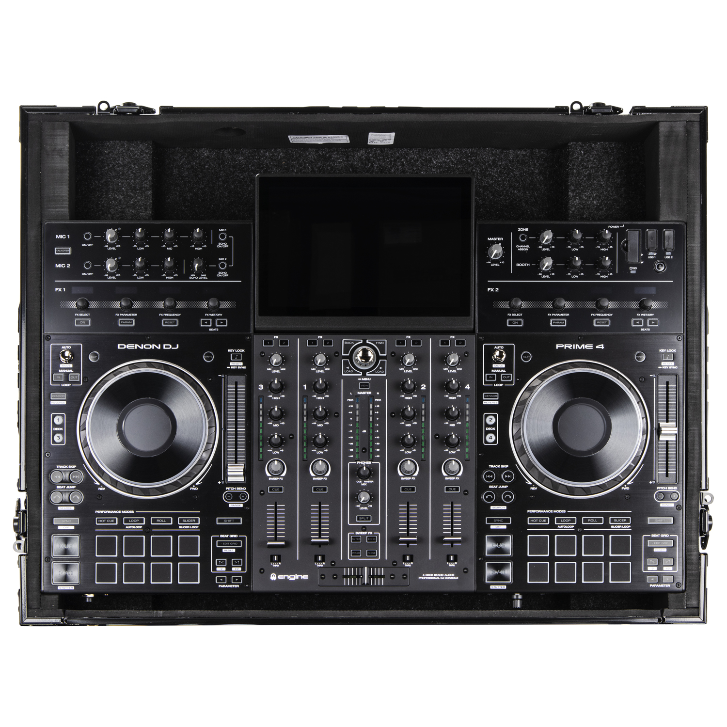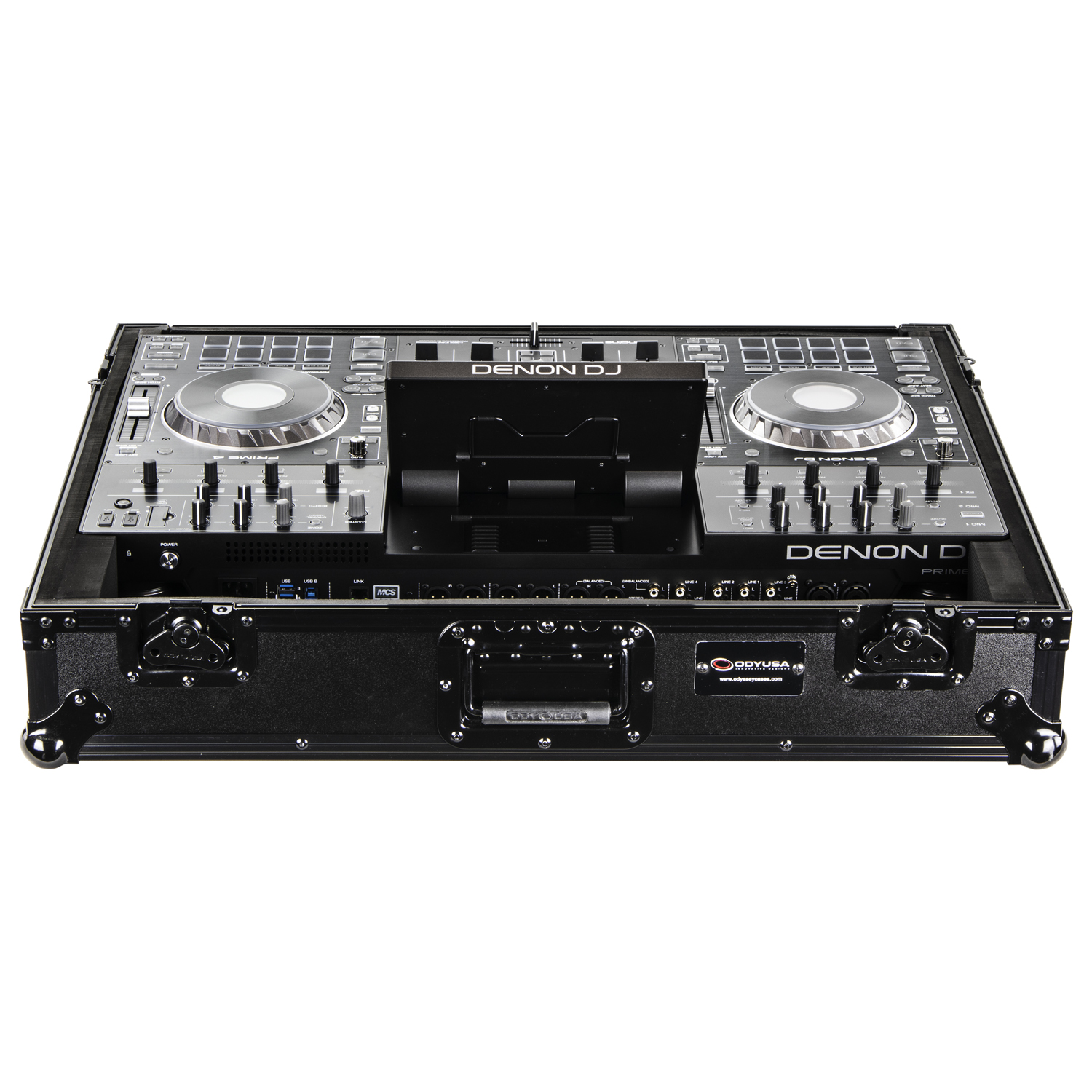 The Black Label™ FRPRIME4BL case is designed to hold the Denon Prime 4 professional 4-Channel DJ Controller. A V-cut™ removable front panel allows easy access to the front controls and headphone/mic jacks. Other features include rubber feet, hefty ball corners, and heavy-duty recessed latches and handle.