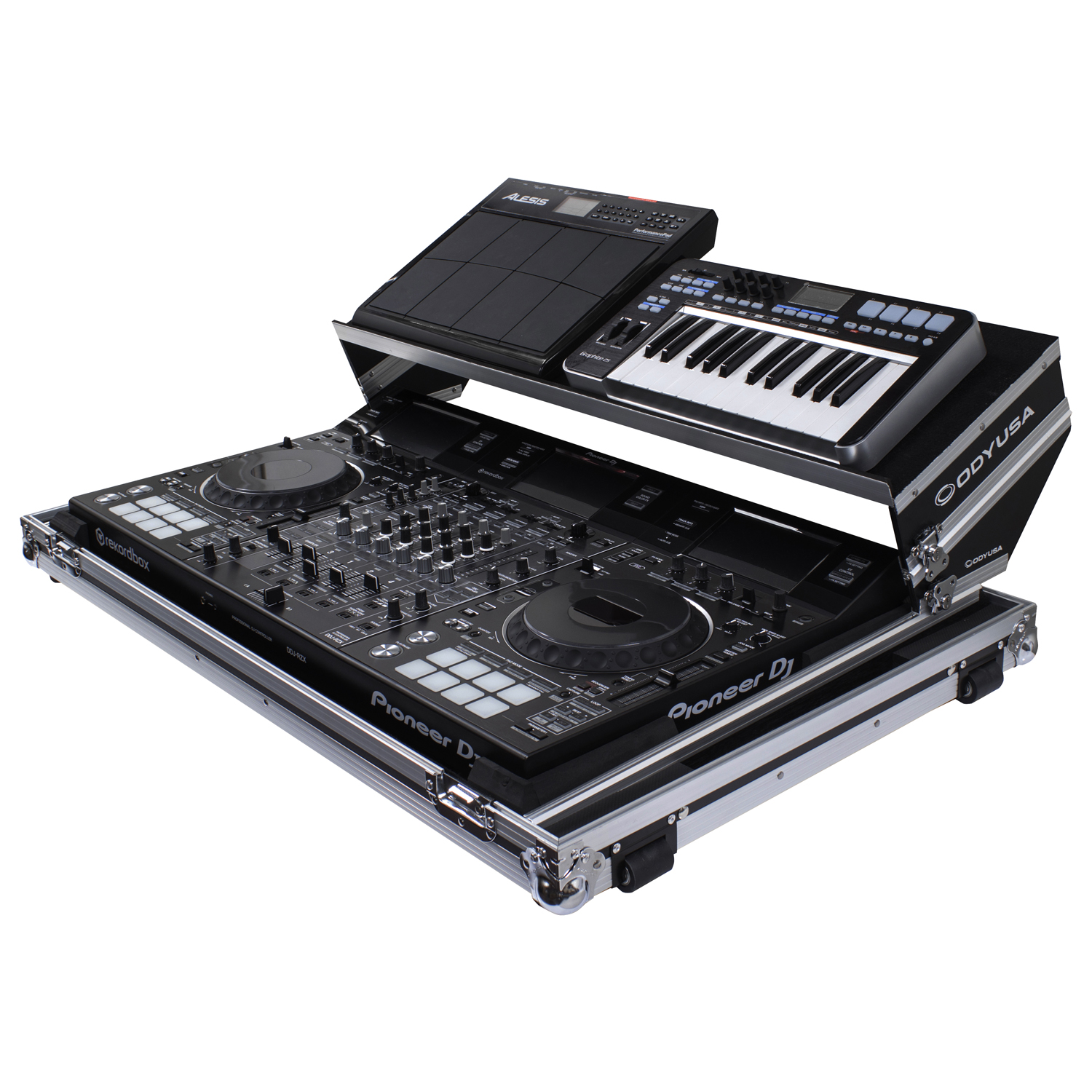The new Odyssey FZGSADDJRZXW Flight Zone™ case features a sleek reverse lid shallow bottom design that allows easy access to the Pioneer DDJ-RZX's front headphone jacks ports, and as part of our exciting new 'GSA' Producer Glide Style™ Series design, it also features a new "angle" to our patented Glide Style™ platform. Now you can choose to configure the gliding platform in the standard setup with a flat top surface, or add the additional side support panels that are included with the case to position the platform higher and at an angle. Either way, it's perfect for placing your laptop, tablet, effect processor, modular synthesizer, and other gear right where you want over the controller. Enhance your overall performance by using the angled configuration for superior visualization and reach of your remix production gear's knobs, trigger pads, faders, screens, switches, buttons, keys, etc.