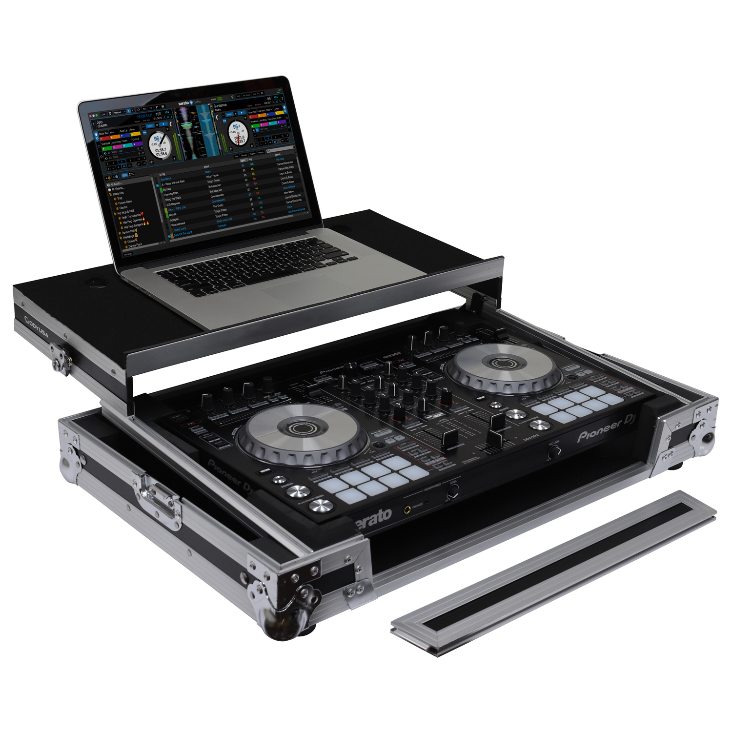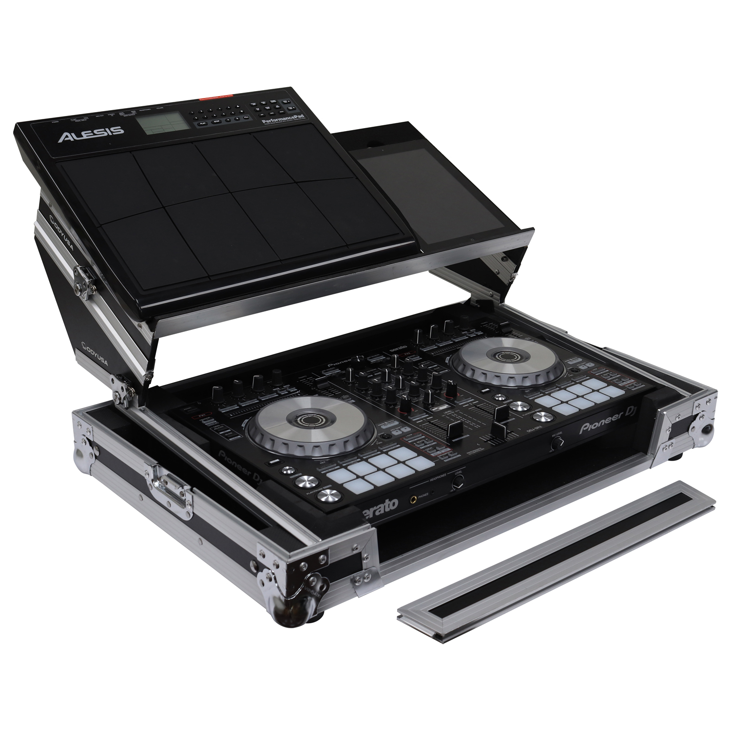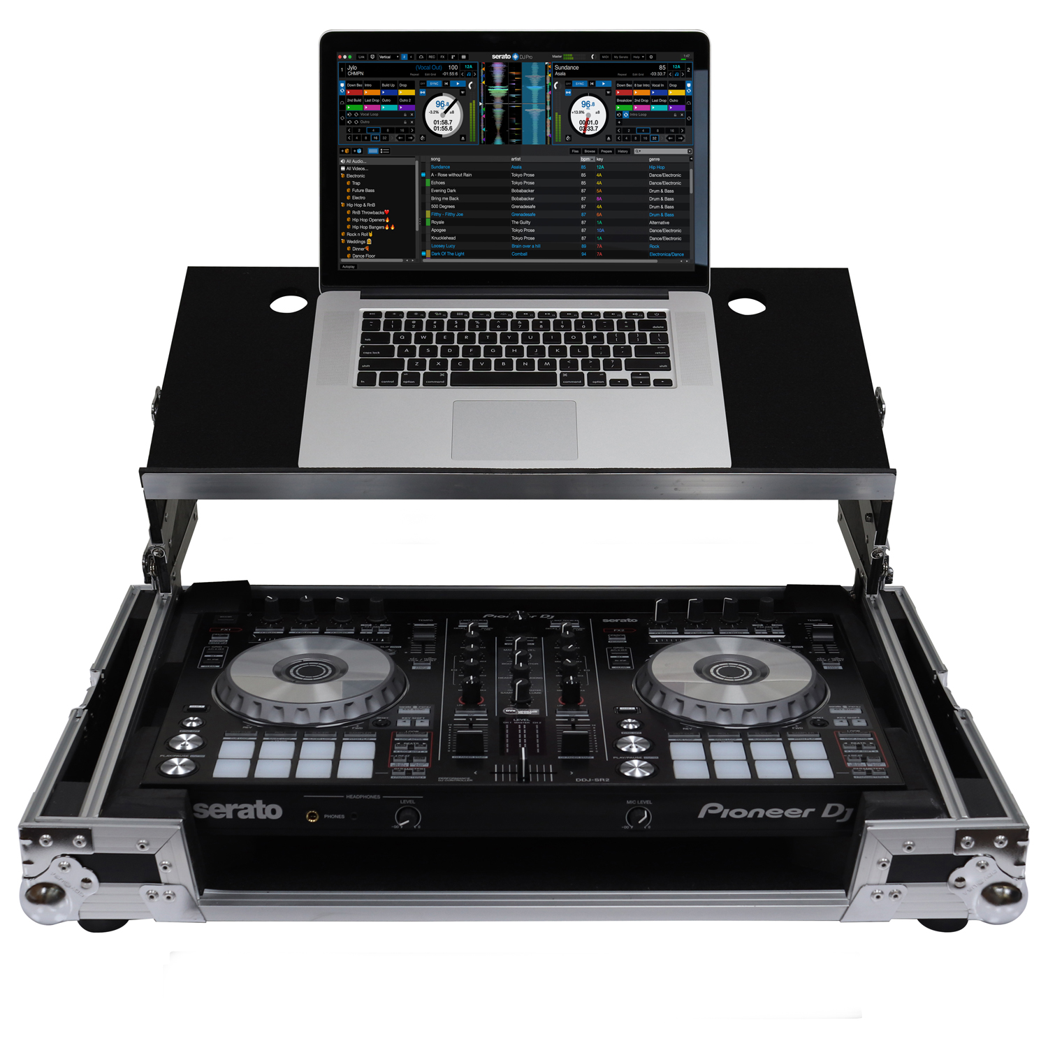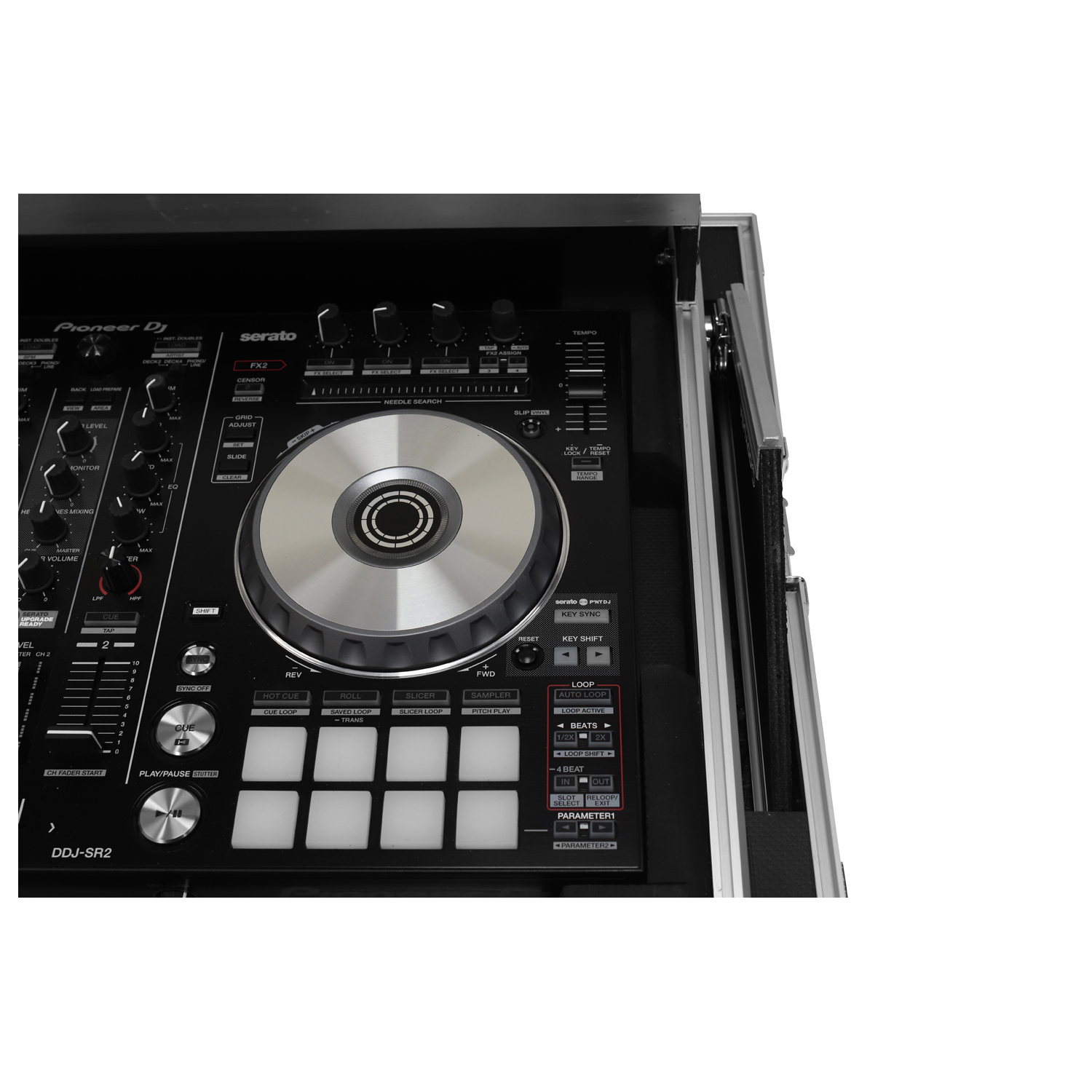 The new Odyssey FZGSADDJSR2 Flight Zone™ case includes a removable V-cut™ front panel allowing access to the all of the Pioneer DDJ-RR, DDJ-SR or DDJ-SR2 controller's front knob controls and input jack ports, and as part of our exciting new 'GSA' Producer Glide Style™ Series design, it features a new 'angle" to our patented Glide Style™ platform. Now you can choose to configure the gliding platform in the standard setup with a flat top surface, or add the additional side support panels that are included with the case to position the platform higher and at an angle. Either way, it's perfect for placing your laptop, tablet, effect processor, modular synthesizer, and other gear right where you want over the controller. Enhance your overall performance by using the angled configuration for superior visualization and reach of your remix production gear's knobs, trigger pads, faders, screens, switches, buttons, keys, etc.