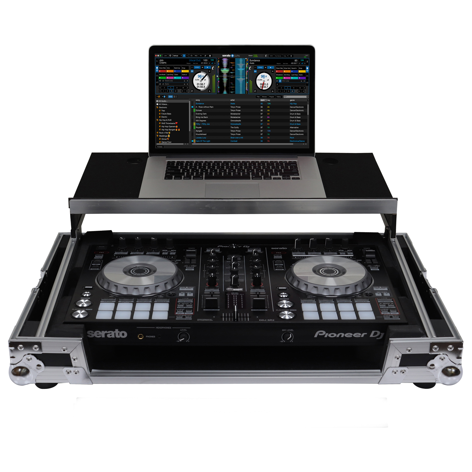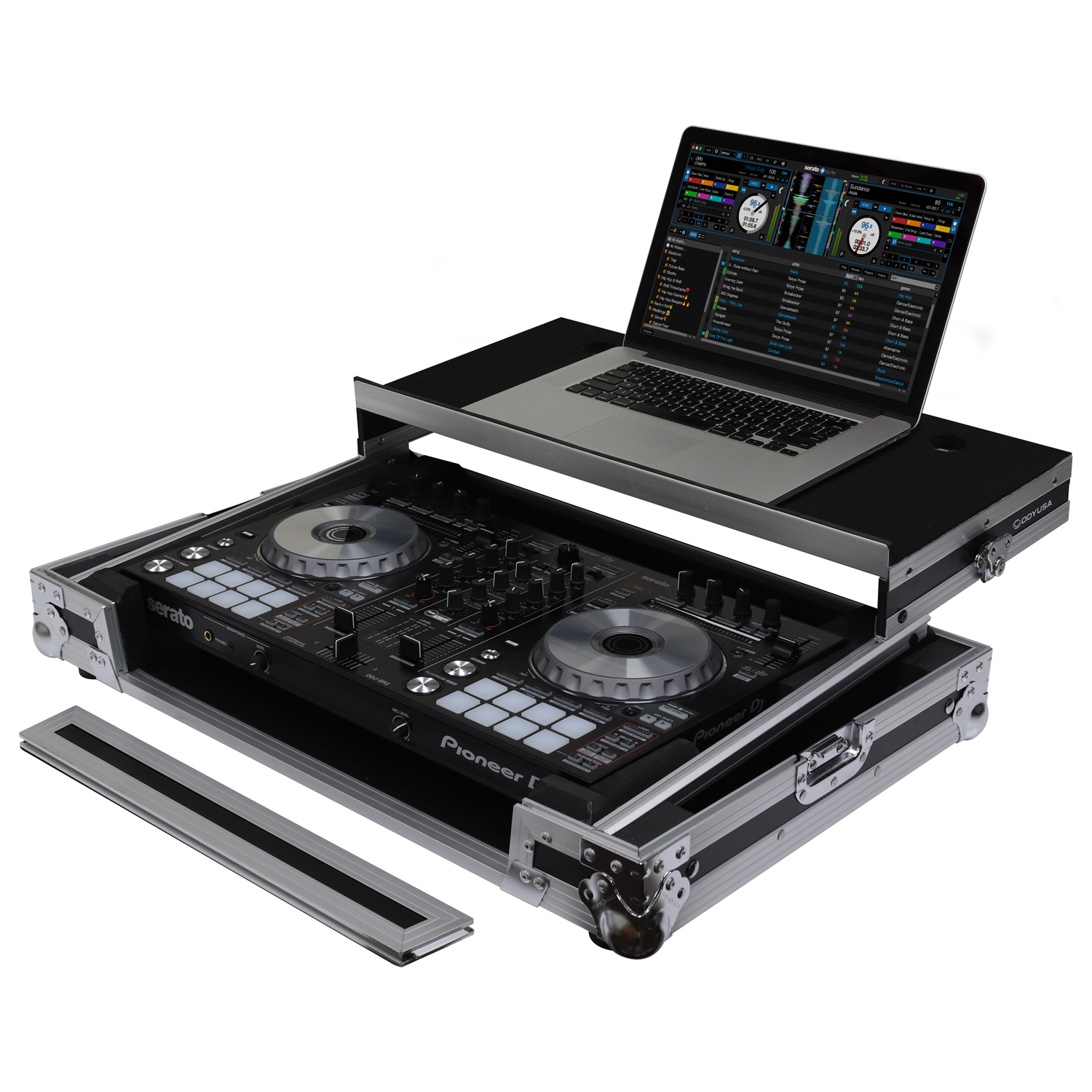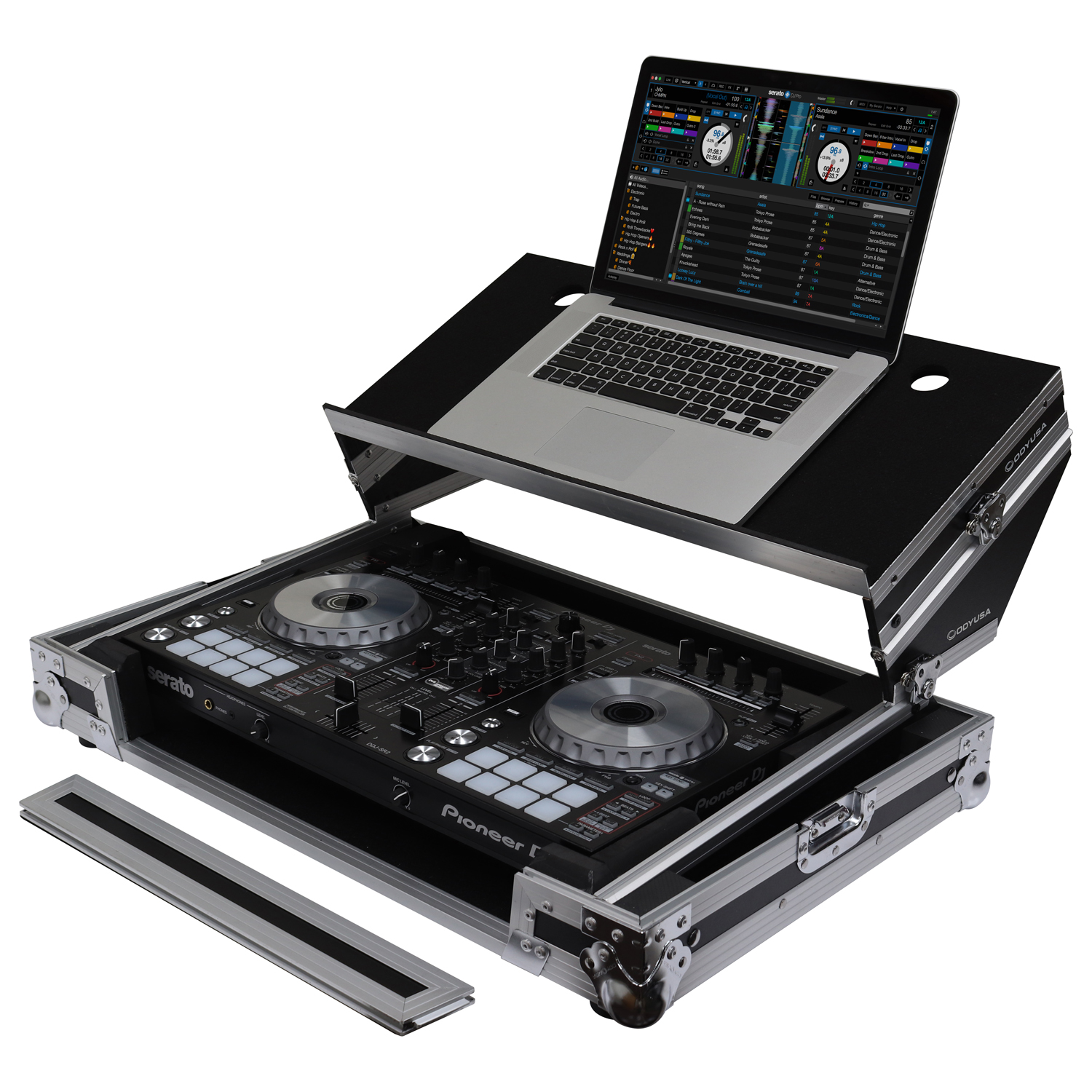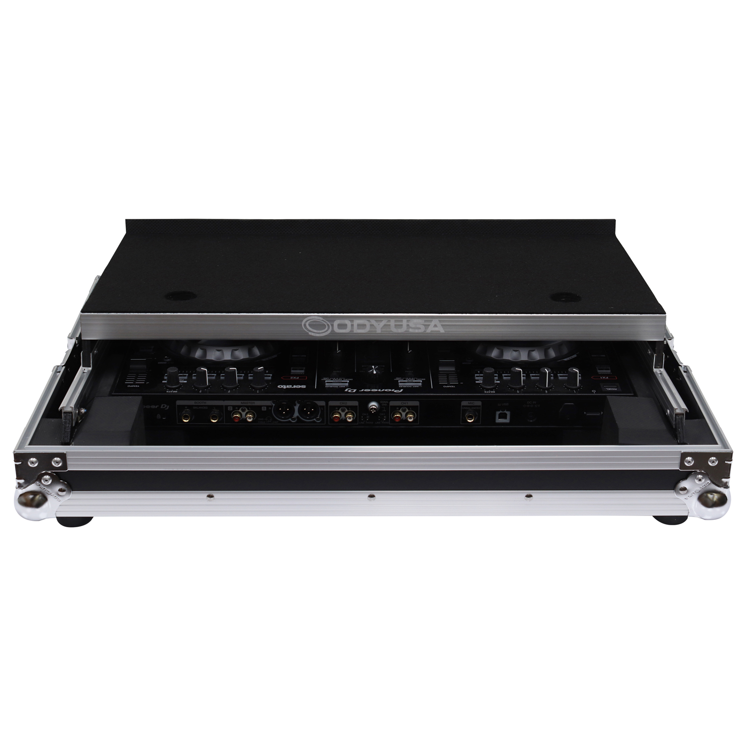 The new Odyssey FZGSADDJSR2 Flight Zone™ case includes a removable V-cut™ front panel allowing access to the all of the Pioneer DDJ-RR, DDJ-SR or DDJ-SR2 controller's front knob controls and input jack ports, and as part of our exciting new 'GSA' Producer Glide Style™ Series design, it features a new 'angle" to our patented Glide Style™ platform. Now you can choose to configure the gliding platform in the standard setup with a flat top surface, or add the additional side support panels that are included with the case to position the platform higher and at an angle. Either way, it's perfect for placing your laptop, tablet, effect processor, modular synthesizer, and other gear right where you want over the controller. Enhance your overall performance by using the angled configuration for superior visualization and reach of your remix production gear's knobs, trigger pads, faders, screens, switches, buttons, keys, etc.
