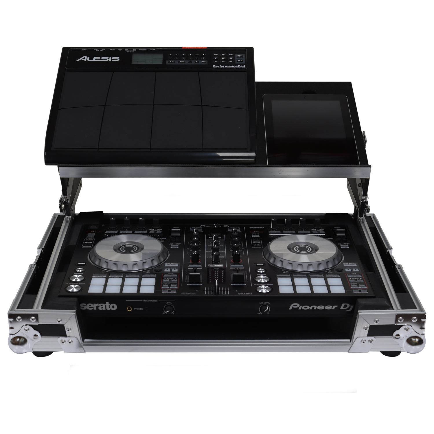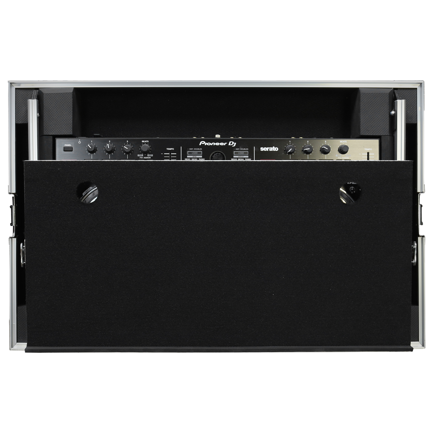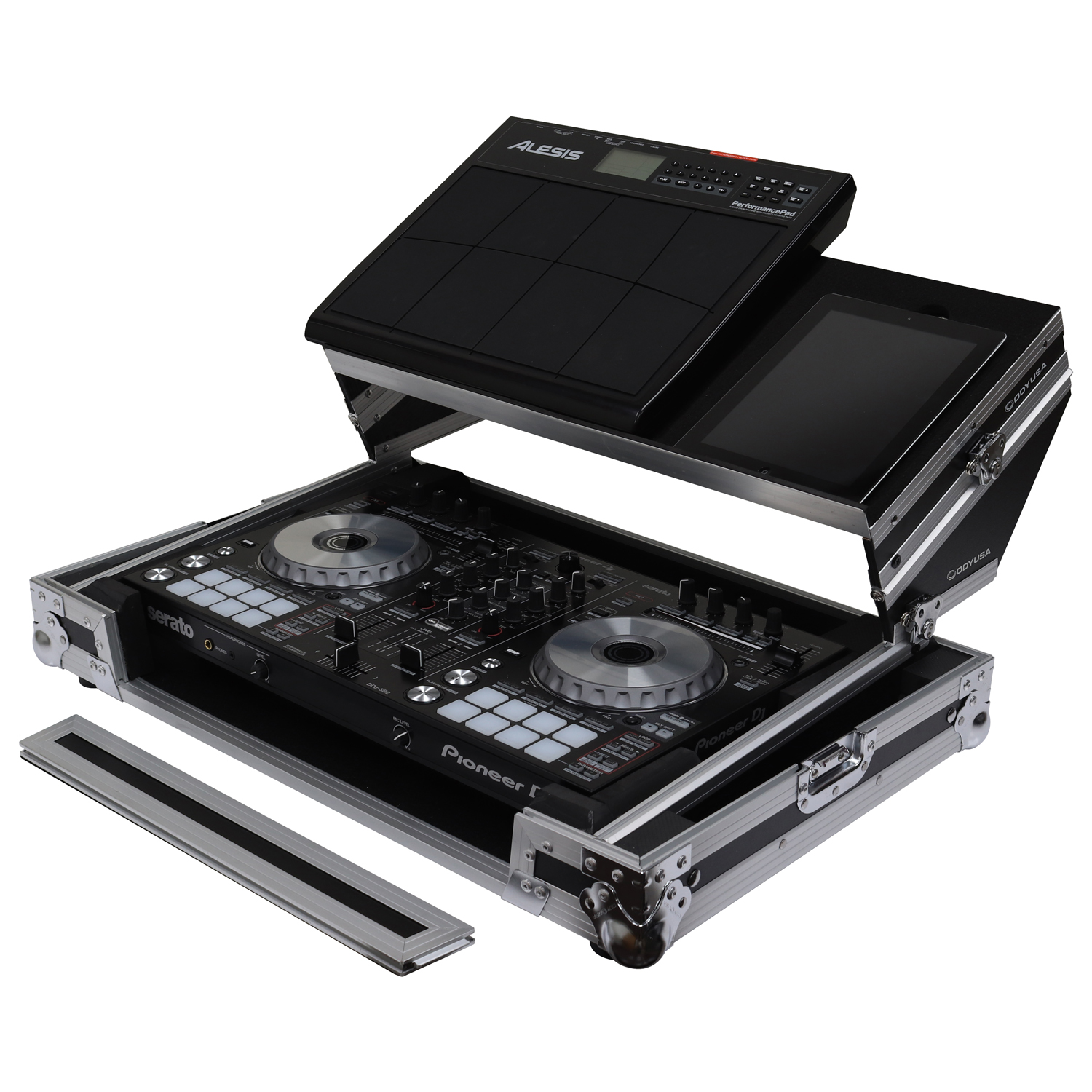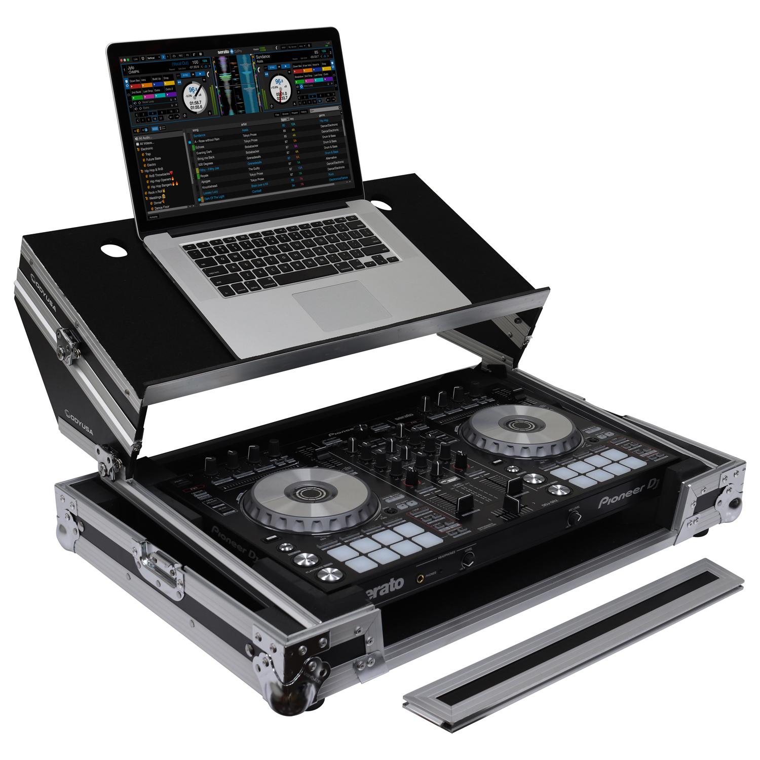 The new Odyssey FZGSADDJSR2 Flight Zone™ case includes a removable V-cut™ front panel allowing access to the all of the Pioneer DDJ-RR, DDJ-SR or DDJ-SR2 controller's front knob controls and input jack ports, and as part of our exciting new 'GSA' Producer Glide Style™ Series design, it features a new 'angle" to our patented Glide Style™ platform. Now you can choose to configure the gliding platform in the standard setup with a flat top surface, or add the additional side support panels that are included with the case to position the platform higher and at an angle. Either way, it's perfect for placing your laptop, tablet, effect processor, modular synthesizer, and other gear right where you want over the controller. Enhance your overall performance by using the angled configuration for superior visualization and reach of your remix production gear's knobs, trigger pads, faders, screens, switches, buttons, keys, etc.