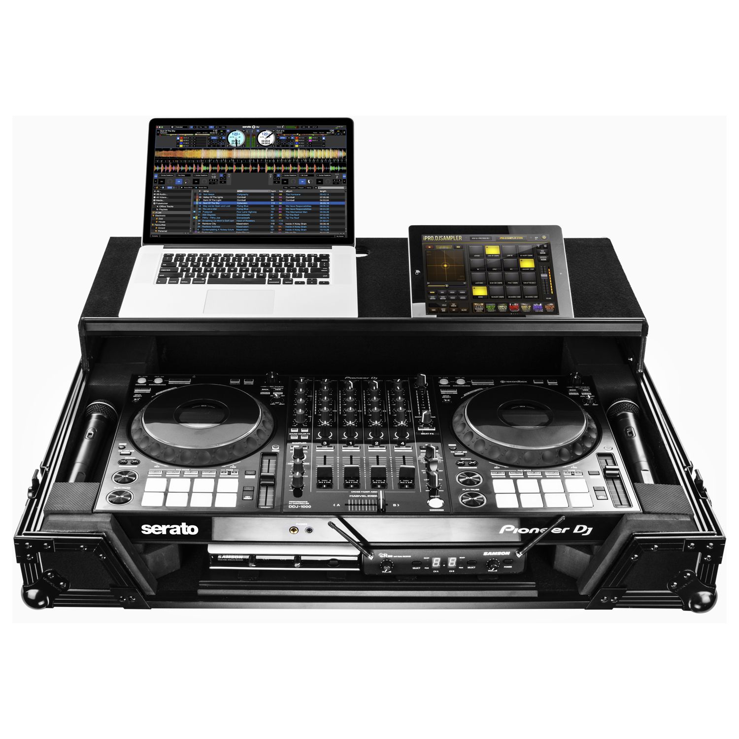 The Odyssey FZGSDDJ1000WGTB Black Label™ case has an extra wide removable front panel allowing proper access to the all of the DJ controller's front knob controls and input jack ports. It features our patented Glide Style™ platform perfect for positioning your laptop, tablet, effect processors, and other gear right where you want it over the Pioneer DDJ-1000 or DDJ-1000SRT controller. A cable management port, essential for a clean setup, is positioned below the rear of the player. Also Underneath the controller compartment is another one of Odyssey's signature digital controller case designs; an integrated convenient pullout tray shelf, perfect for placing your hard drive(s), headphones, smart phones, and other essentials out of sight while you show off your mix and tricks.