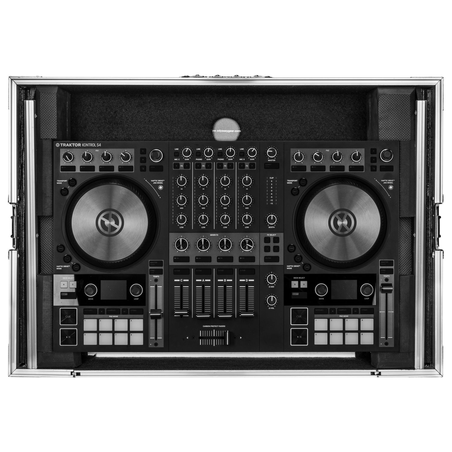The Odyssey FZGSTKS4MK32 Flight Zone™ case includes a removable V-cut™ front panel allowing access to the all of the DJ controller's front knob controls and input jack ports. It features our patented Glide Style™ platform perfect for positioning your laptop, tablet, effect processors, and other gear right where you want it over the Traktor Kontrol S4 MK3 controller. A cable management port, essential for a clean setup, is positioned below the rear of the player. Also underneath the controller compartment is another one of Odyssey's signature digital controller case designs; a pre-installed 2U 19" rack mount space below the controller space perfect for rack mount gear such as wireless mic systems, power strip, drive rack, or storage drawer. The mounting hardware included allows for front or rear rack mounting and can be removed all together if needed.