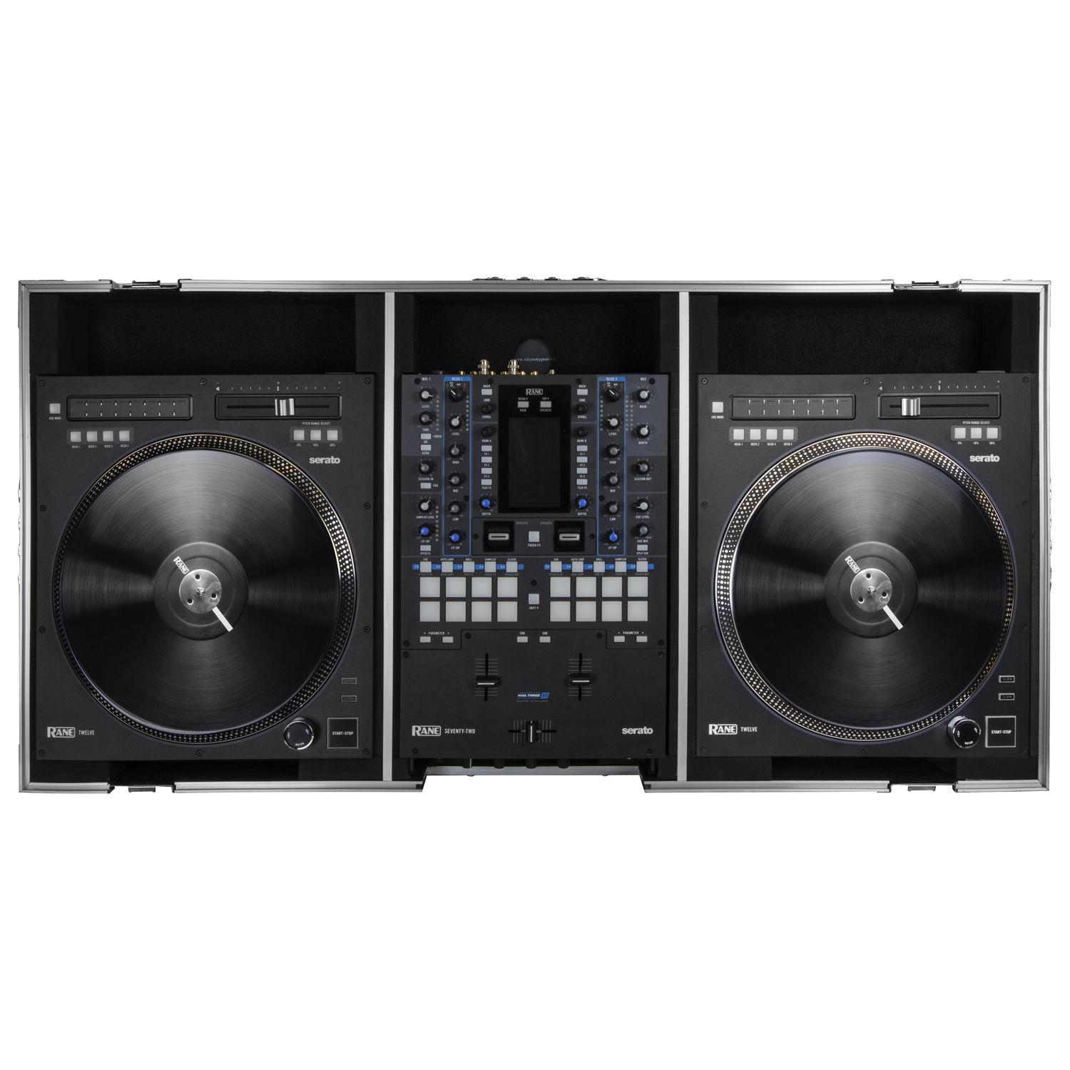 Our Flight Zone® Series FZRANE1272W DJ coffin is specifically made for the Rane Twelve motorized turntable controller and Seventy / Seventy-Two DJ mixer. They sit perfectly inside the FRANE1272W DJ battle coffin case with plenty of rear space for cable connectivity. With cases like this, there's no doubt why Odyssey's ATA designs "Rane" supreme in the DJ flight case industry.