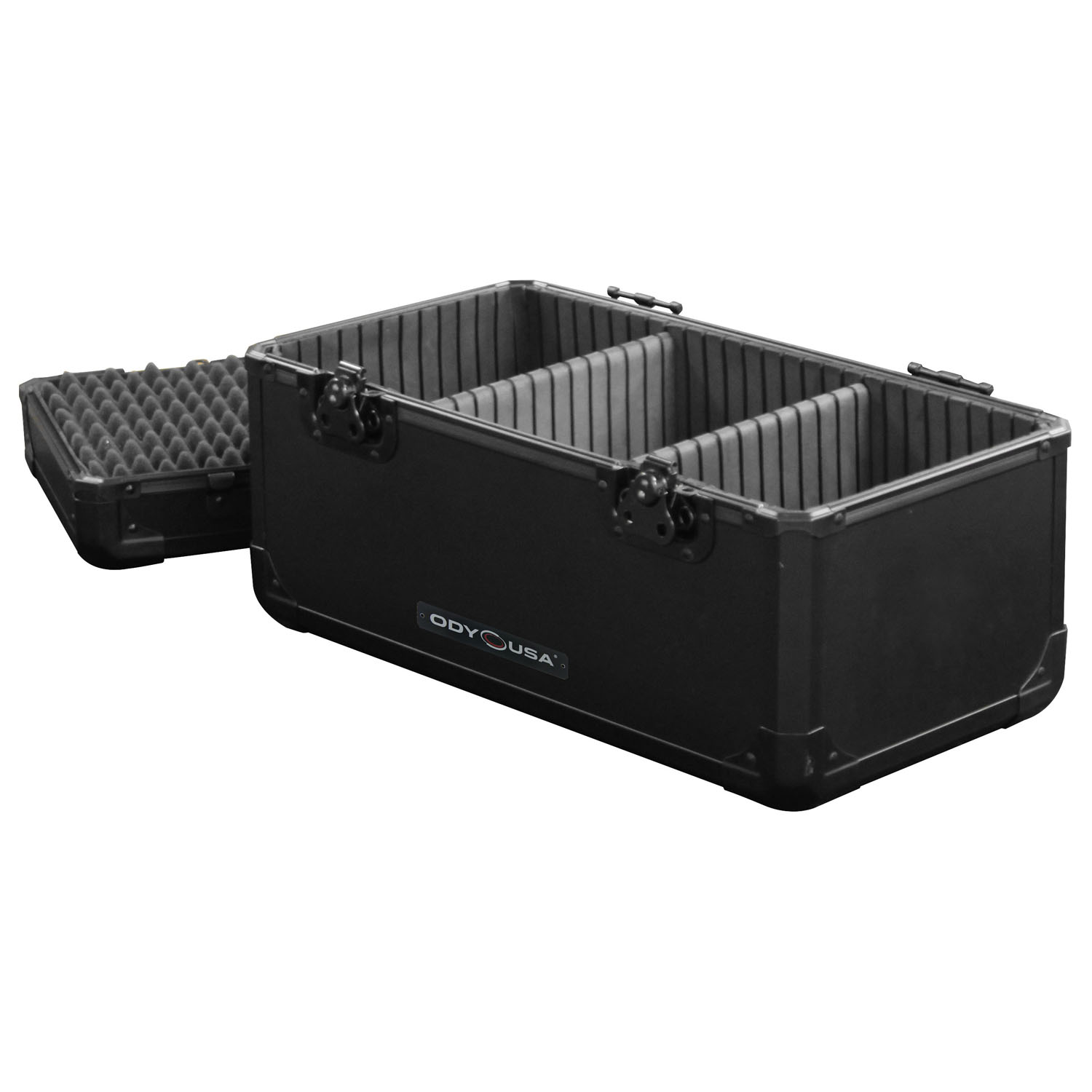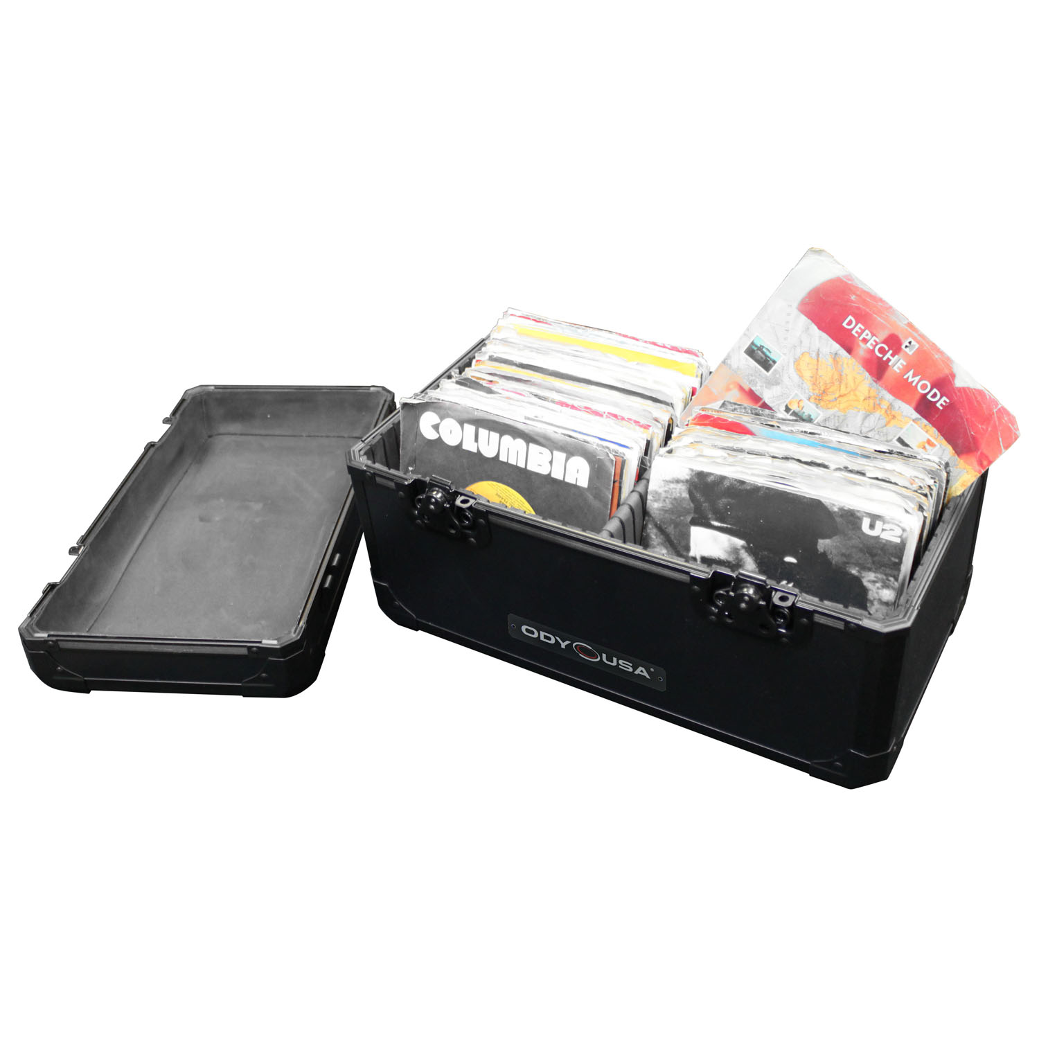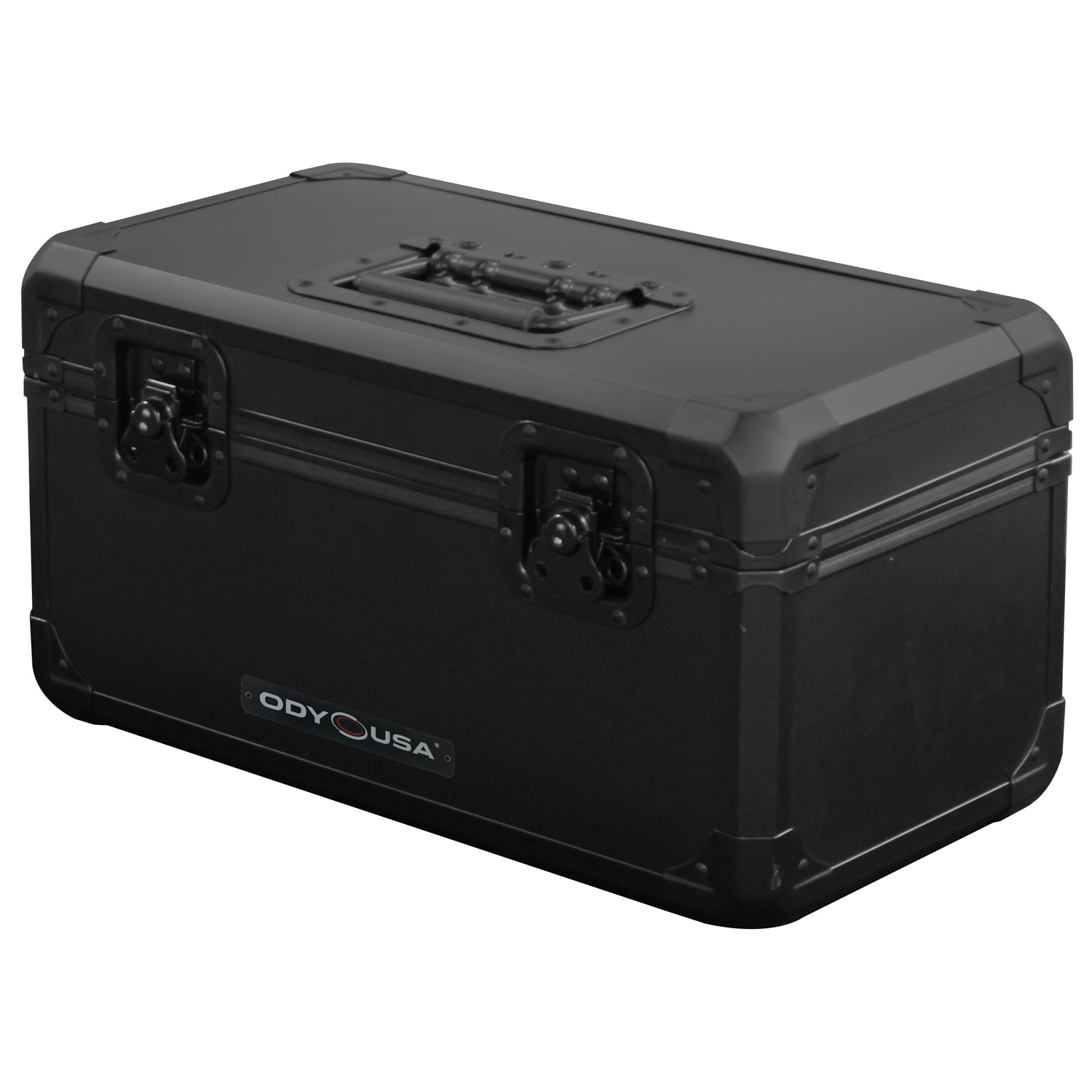 Odyssey's Black Krom™ cases are made to the same standards as our original Krom™ series, but with a twist. The hardware including the aluminum trim are coated a sleek "Black". The steel corners are uniquely hexagon-shaped and each also features rubber feet for stacking multiple record cases, a must for large 7" record collections of vinyl purists and DJs who are true to the art of turntablism. The K45120BL has a fully foam-lined interior, heavy-duty recessed handle, and front latches with padlock loops. Black Krom™ cases, slick, stealthy, and beyond cool!