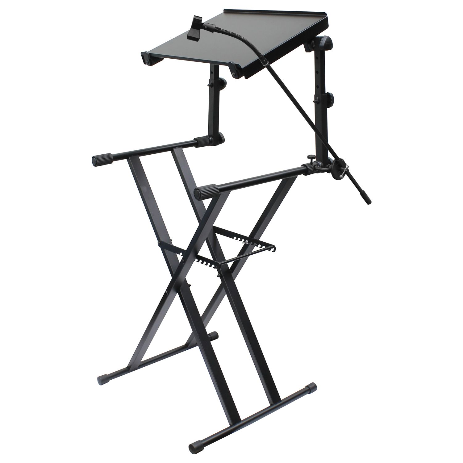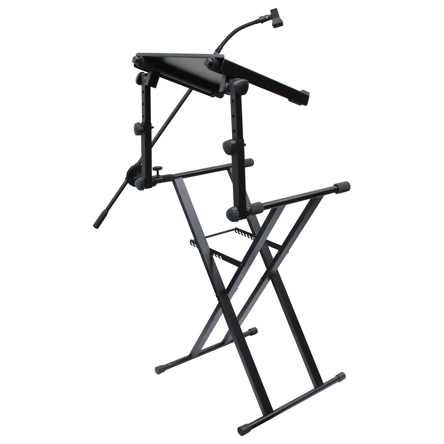 The LTBXS2MTCP, X-STAND COMBO PACK, features a two tier X-Stand with a removable 19" wide top shelf that allows you to use your laptop or other gear safely, securely, and conveniently over your mixing console controller system. In addition, also included is a matching color mic clip, 8" long goose neck, and 30" long boom arm. Fully assembled, it can all be easily attached to the stand and adjusted in seconds to the perfect angle for mic positioning. Designed for DJ controller setups that don't require an extra heavy-duty support system, this X-Stand model with its steel/aluminum powder coated frame is built strong yet light for extra mobility. The X-STAND COMBO PACK includes (1) dual tier X-Stand, (1) mic boom with goose neck & mic clip, and (1) laptop/gear shelf. With all these 'X'tras that comes together with it, well, that's just one 'X'tra cool X-Stand system! Don't you agree?