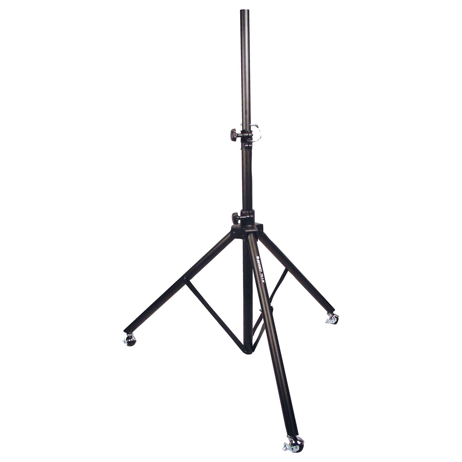 Our LTS1W is a unique black speaker tripod stand constructed with high quality aluminum/steel tubing. It extends 6 feet high and features special wheels with brakes at the bottom of each tripod making it the perfect tripod stand for a follow spot light mounted on top. See our optional BLTUNI tote accessory stand bag, a must for transporting and storing your tripods.