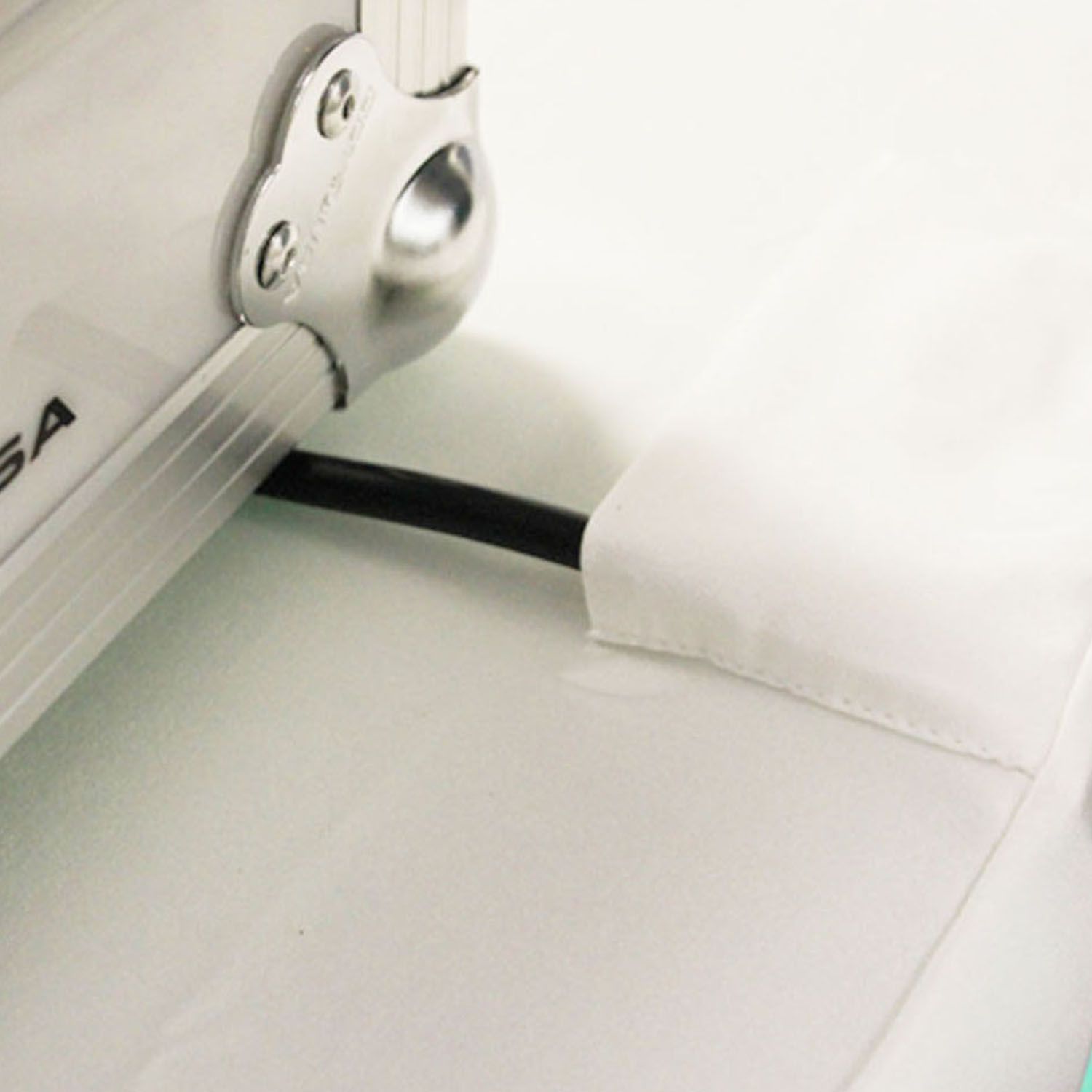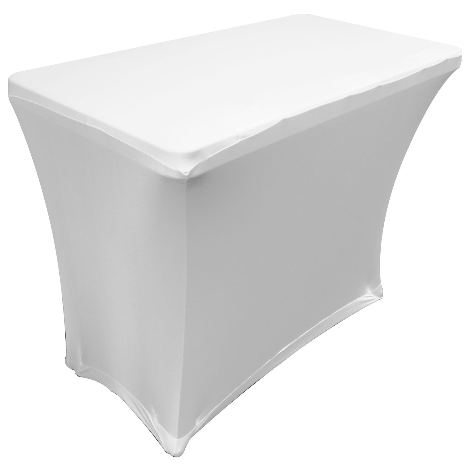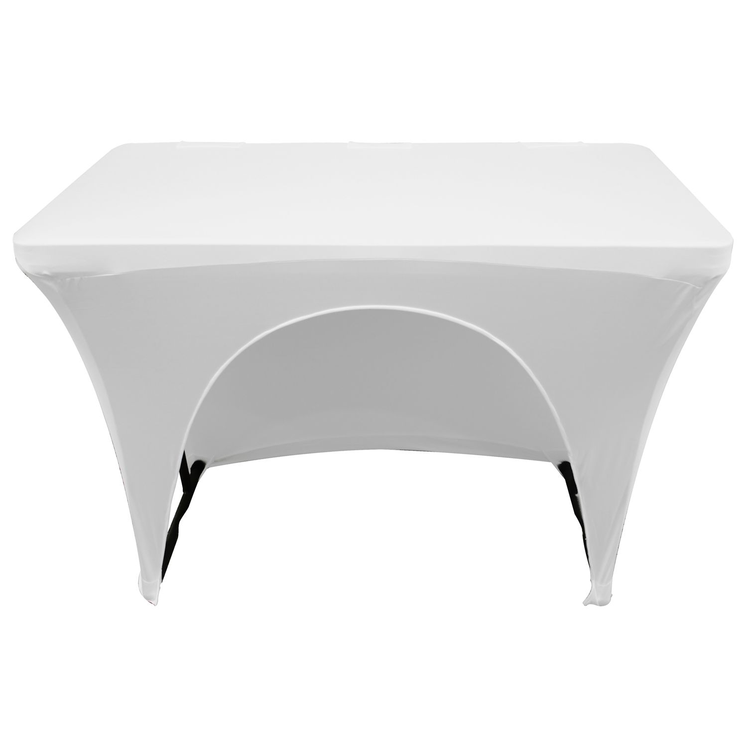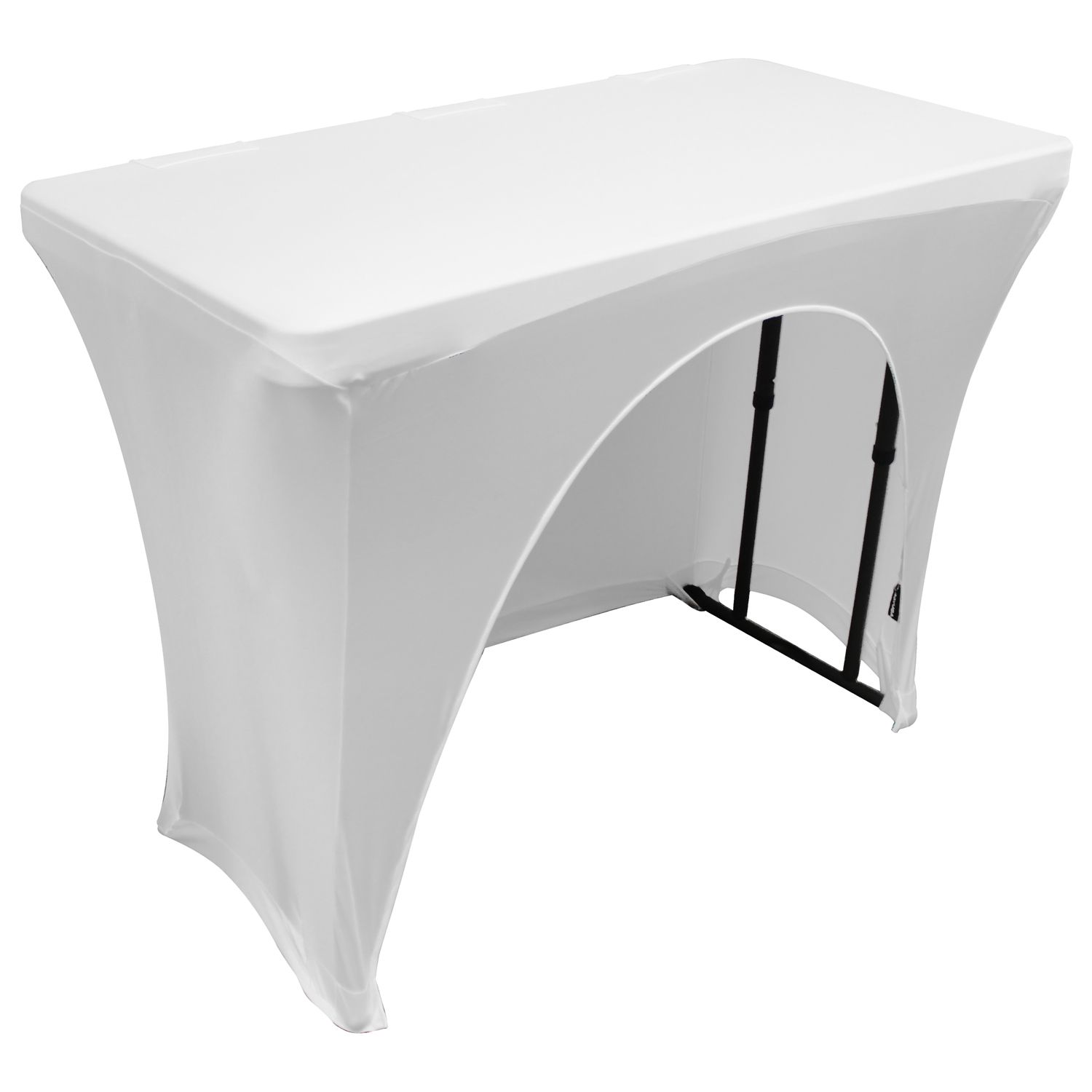 Dress up any standard 4' banquet table with the Scrim Werks™ SPATBL4WHT white Slip Screen™ cover. Simple and easy to use, the SPATBL4WHT stretches snugly over the top of the table down to the 4 leg points projecting a clean professional look to your set up by keeping your cables, gear and other items hidden from your audience. Each features multiple holes strategically positioned near the top edge of the table for discreet cabling. Table Slip Screens™ are also available in black and for 6' banquet Tables. Use a white Slip Screen™ in conjunction with a LED color wash effect underneath for an attention grabbing lighted table display*. Don't let a moment "slip" you by and get yours today!