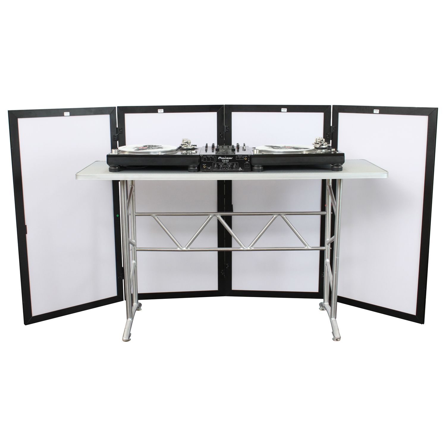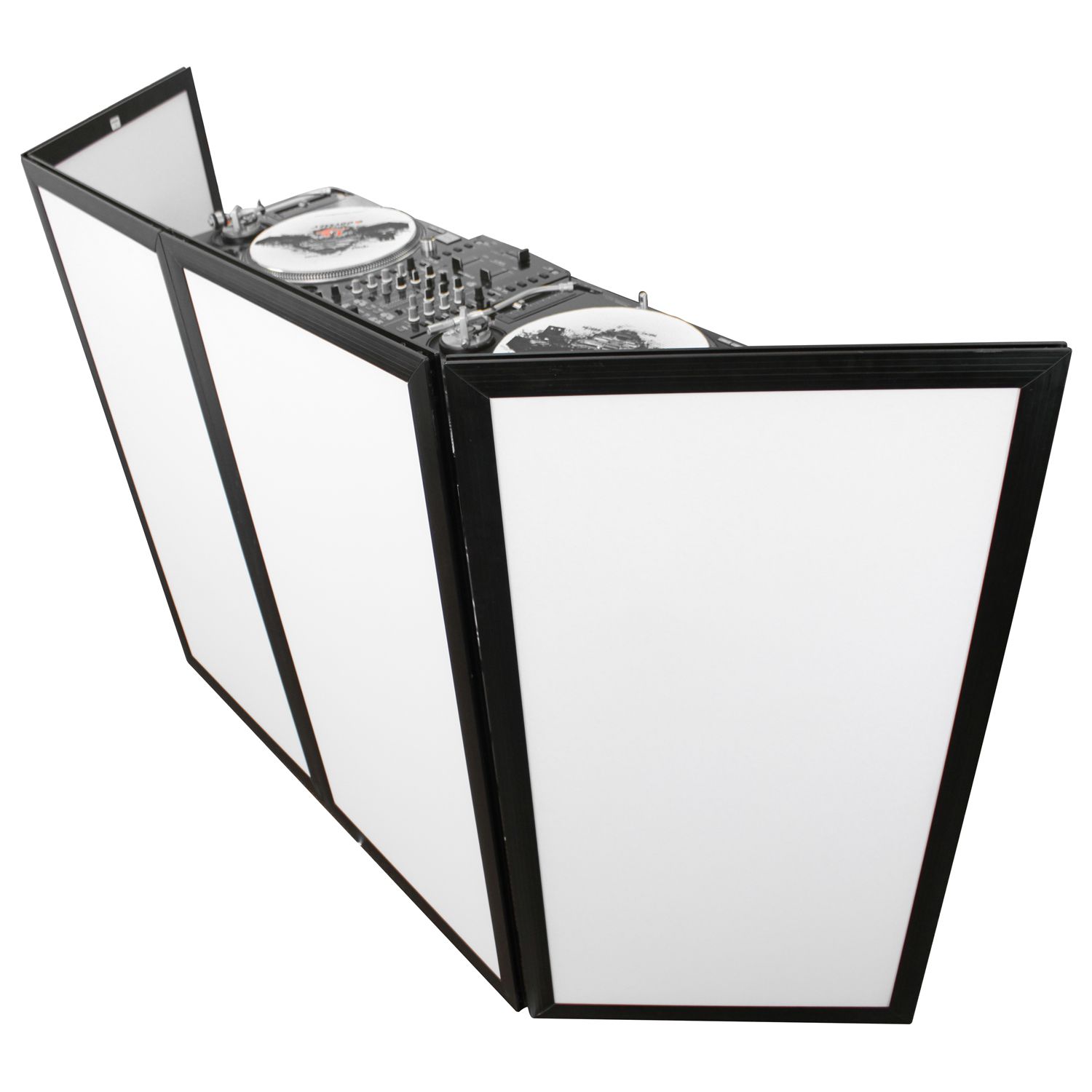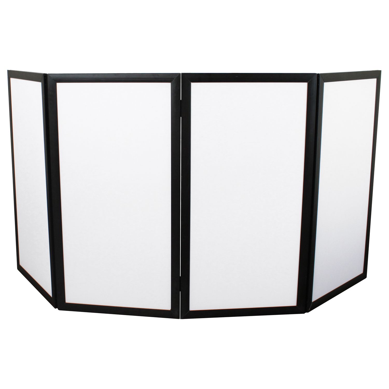 Today's special event DJs continue to step-up their game with more elaborate clean setups. Scrim Werks™ facades are ideal accessories for these entertainers. The SWF4846B is one of four available sizes, each consisting of four detachable steel pin-hinged sections consisting of a super lightweight, black powder coated aluminum frame. Have a larger than usual setup? You can combine the center sections from multiple sets of the same height to create a wider facade if needed. The white dual layer scrim faces are fire retardant treated and can be used in conjunction with lighting effects* to create that perfect look for any momentous occasion. After the gig, if you find a stain on the scrim from an accidental drink spill or other mishap, no problem. All that is required is a screw driver to simply remove the scrim for cleaning**.